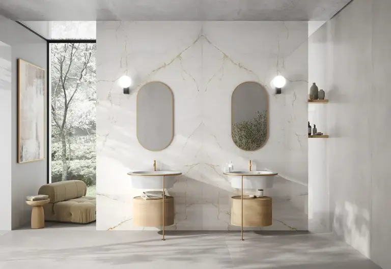 En el corazón de la Toscana, se encuentra el encantador pueblo de Lucca, un lugar donde las calles empedradas y los monumentos susurran historias de una belleza atemporal. Bajo esta inspiración nace Lucca Gold. Su base de blanco puro sirve como lienzo para la danza delicada de sus vetas color ceniza, mientras destellos dorados emergen como rayos de sol que acarician las colinas toscanas al amanecer.