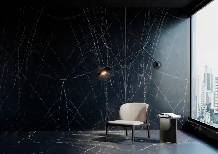 Originario de las canteras del norte de España, en el País Vasco, este material es un clásico entre los mármoles negros. Elegancia y sobriedad son sus dos cualidades principales. Sus tonos oscuros contrastan con sus marcadas vetas blancas, que atraviesan la pieza aportando un gran movimiento a su gráfica.