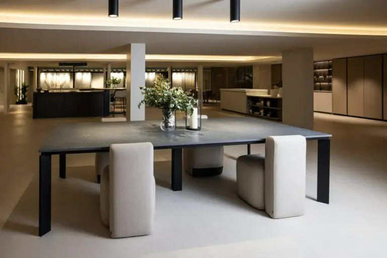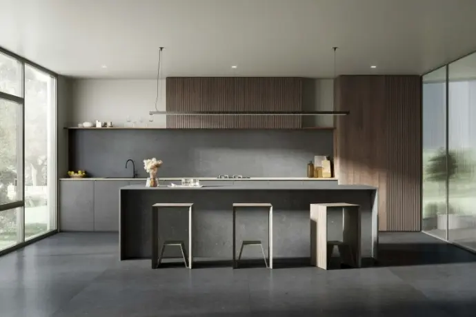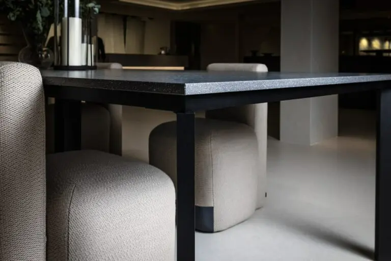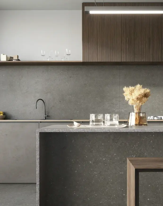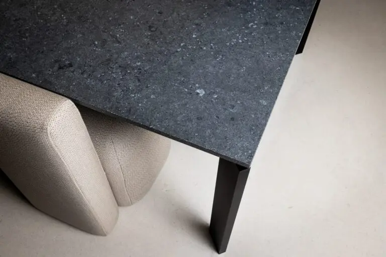Con su poderosa y singular estética, Pierre Bleue encapsula la esencia de una piedra negra que desafía el paso del tiempo. Cada detalle en su superficie cuenta una historia mineral, donde pequeños fósiles, vetas y texturas se entrelazan con gran delicadeza. El resultado es un material de una profunda riqueza geológica y una complejidad visual inspirada en la emblemática piedra belga.